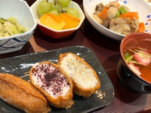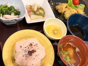 菜飯・けんちん汁・揚げ鶏のごま照り焼き・長いものみそバターソテー・豆腐とトマトのサラダ・デザート